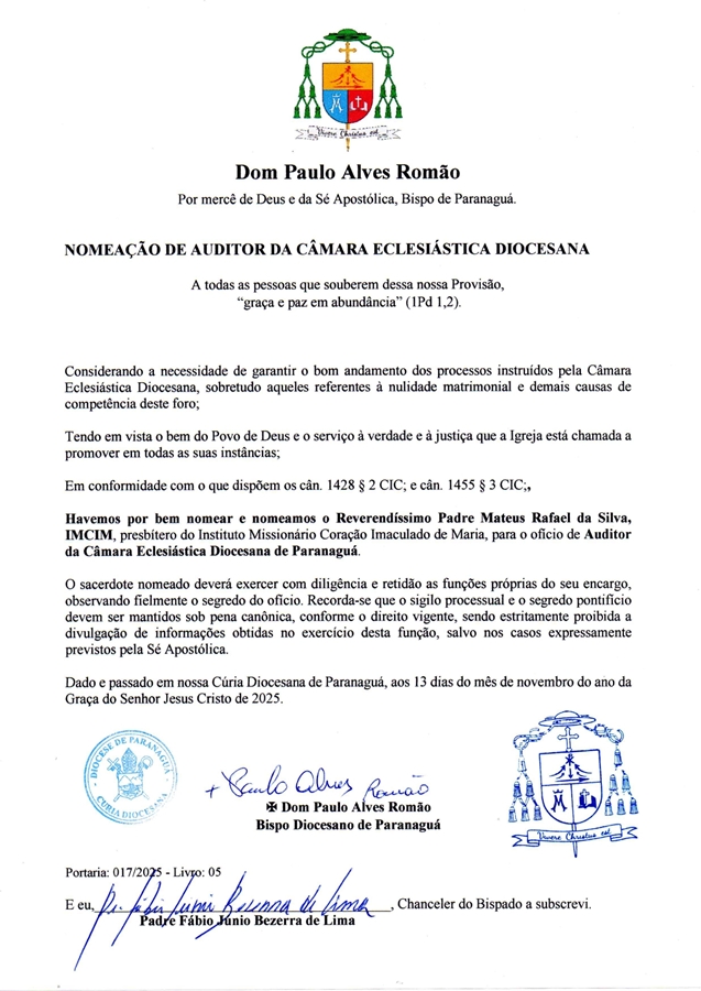 Pe. Mateus Rafael da Silva, IMCIM Categoria: Nomeações13/11/2025Navegação de post:AnteriorPost anterior:Nota DoutrinalPróximoPróximo post:Auditor